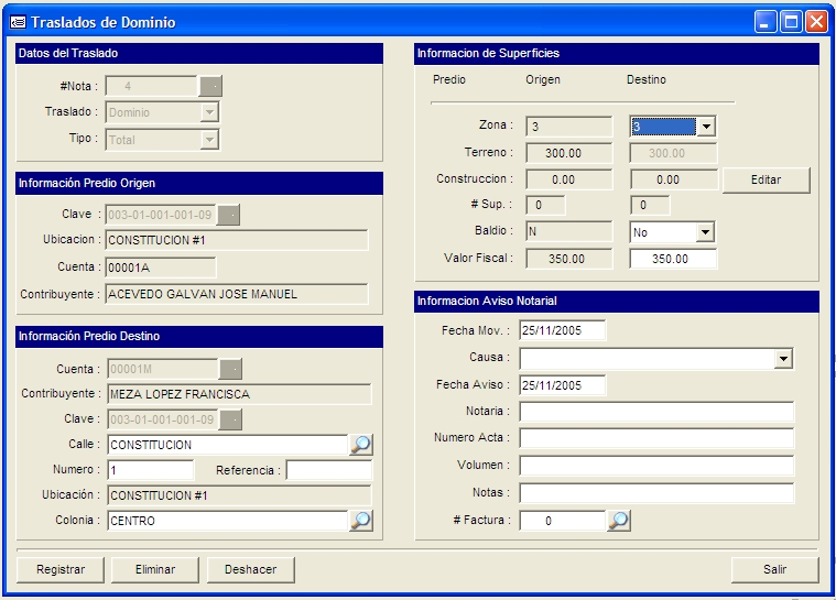 - Control del histórico de movimientos de Predios por cambios derivados de traslados de dominio.