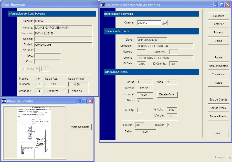 - Impresión de formatos varios en ambiente gráfico ej.- Estados de Cuenta, Cédula del Predio, Tarjeta Predial, Constancias, etc.