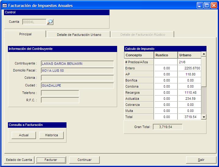 - Integración TOTAL de predios RUSTICOS Y URBANOS en un mismo sistema. Con lo cual NO se requiere hacer uso de dos módulos o sistemas de cobro. Además, el sistema controla y distingue los saldos de predios rústicos y urbanos además de manejar el saldo por CONTRIBUYENTE.