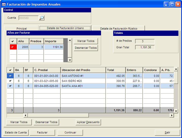 - Facturación Selectiva: Es posible facturar algunos años y/o algunos predios de una cuenta.